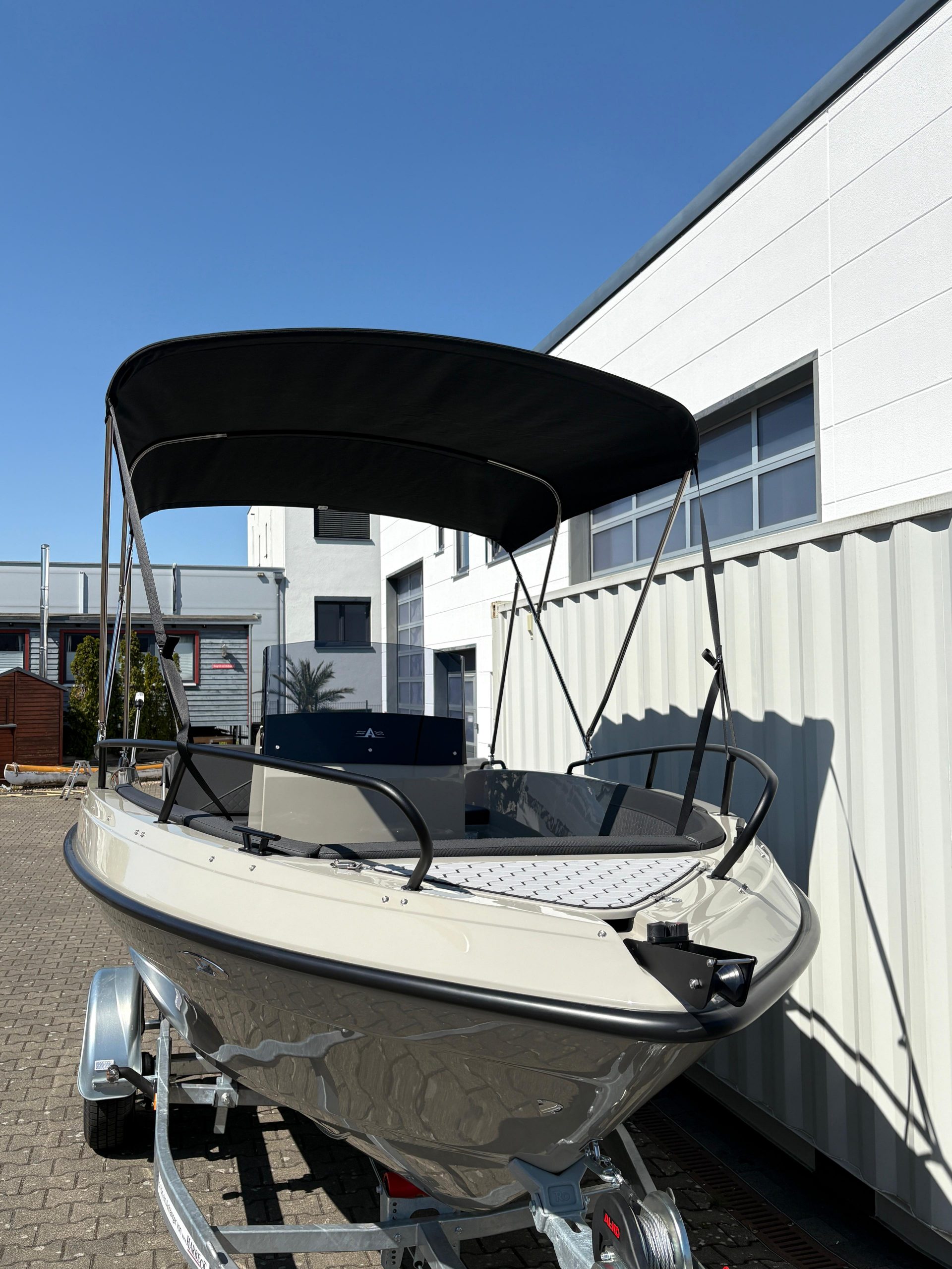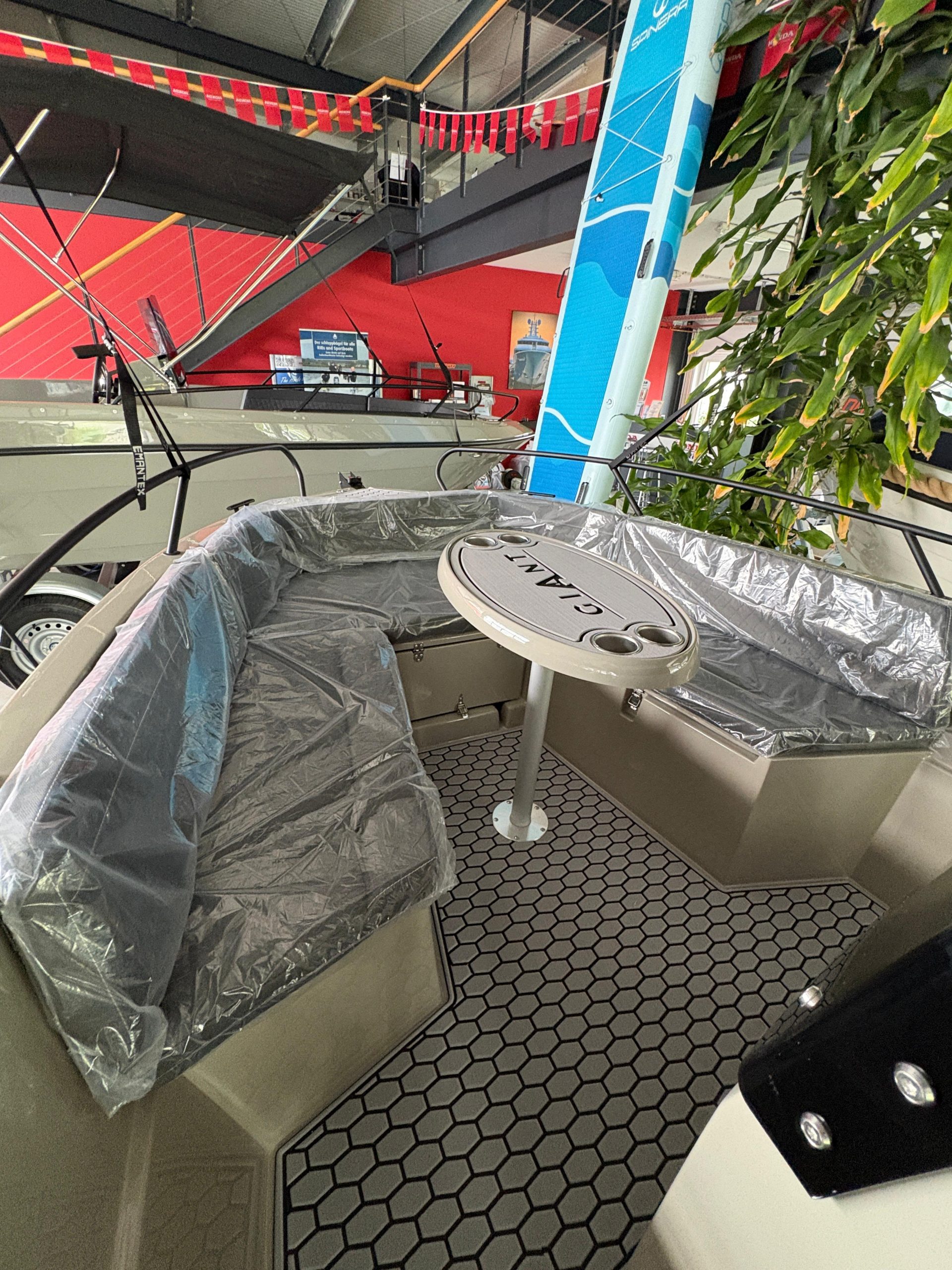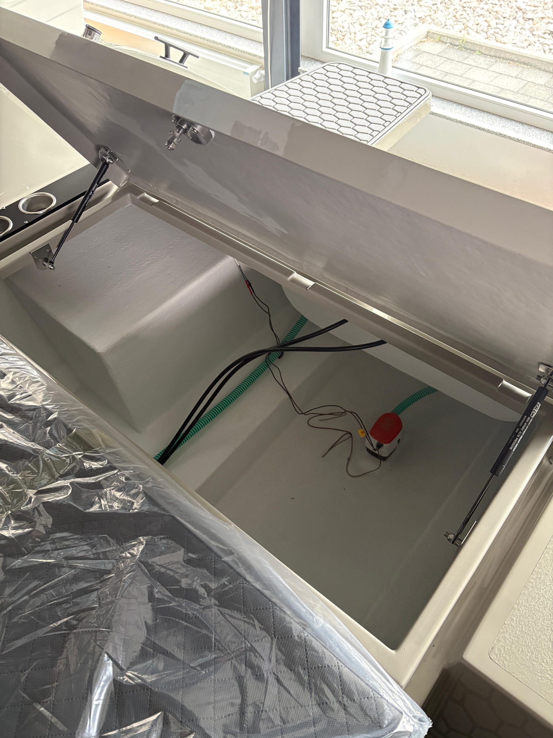 selbstlenzendes Cockpit, 4x Klampen, Windschutzscheibe, große Reling vorne und kurze Reling hinten, Ankerrolle, Polster inkl. Sonnenliege