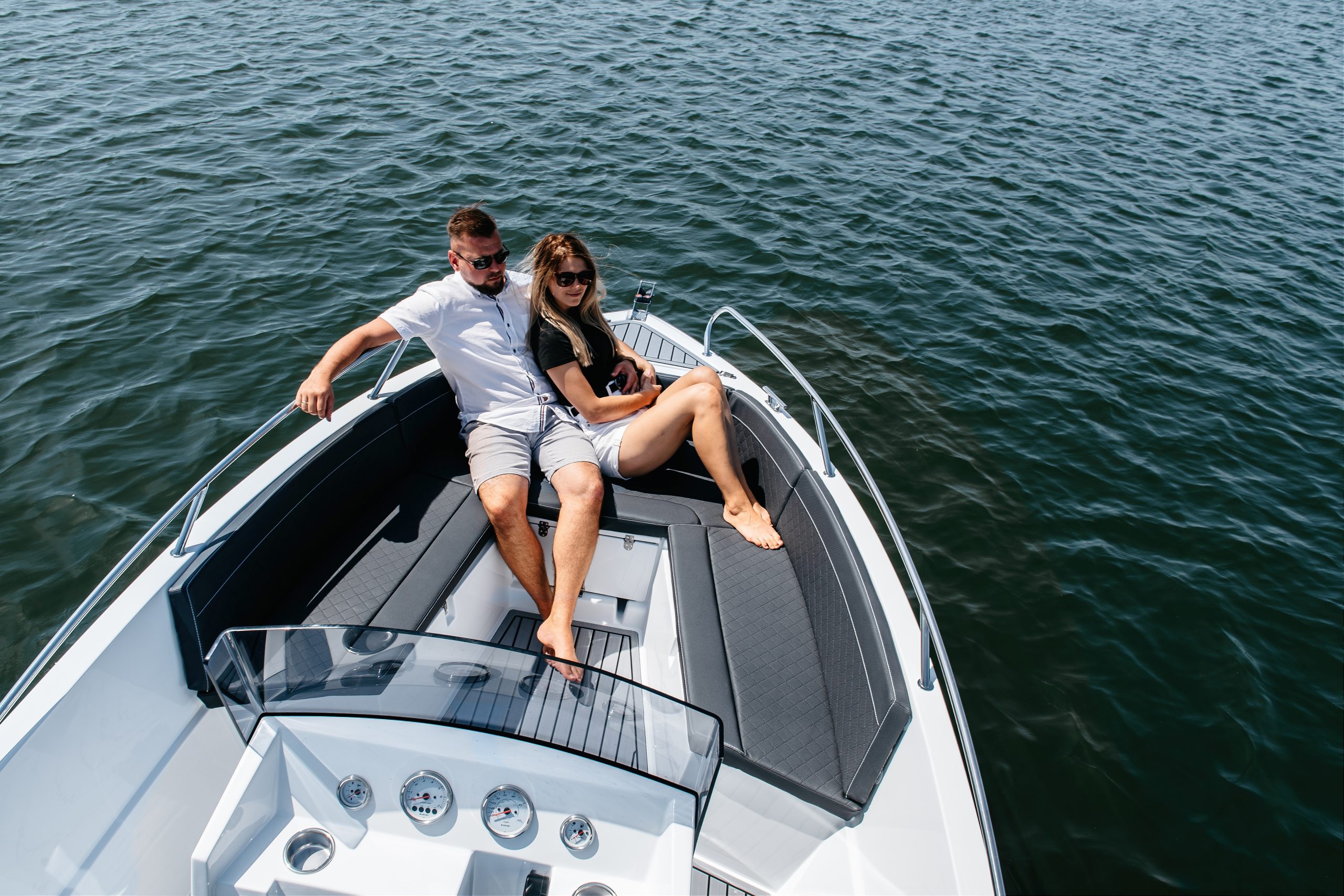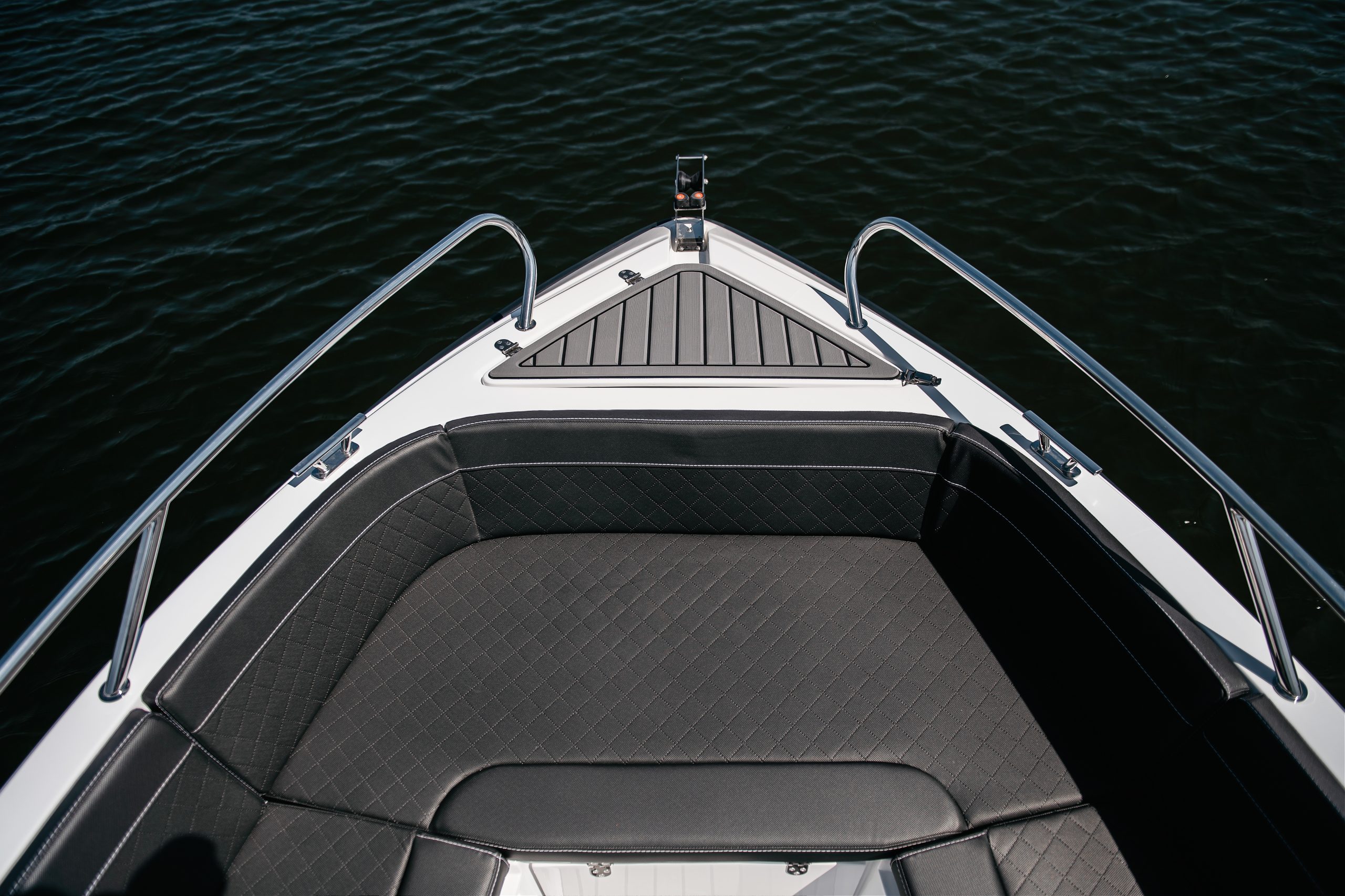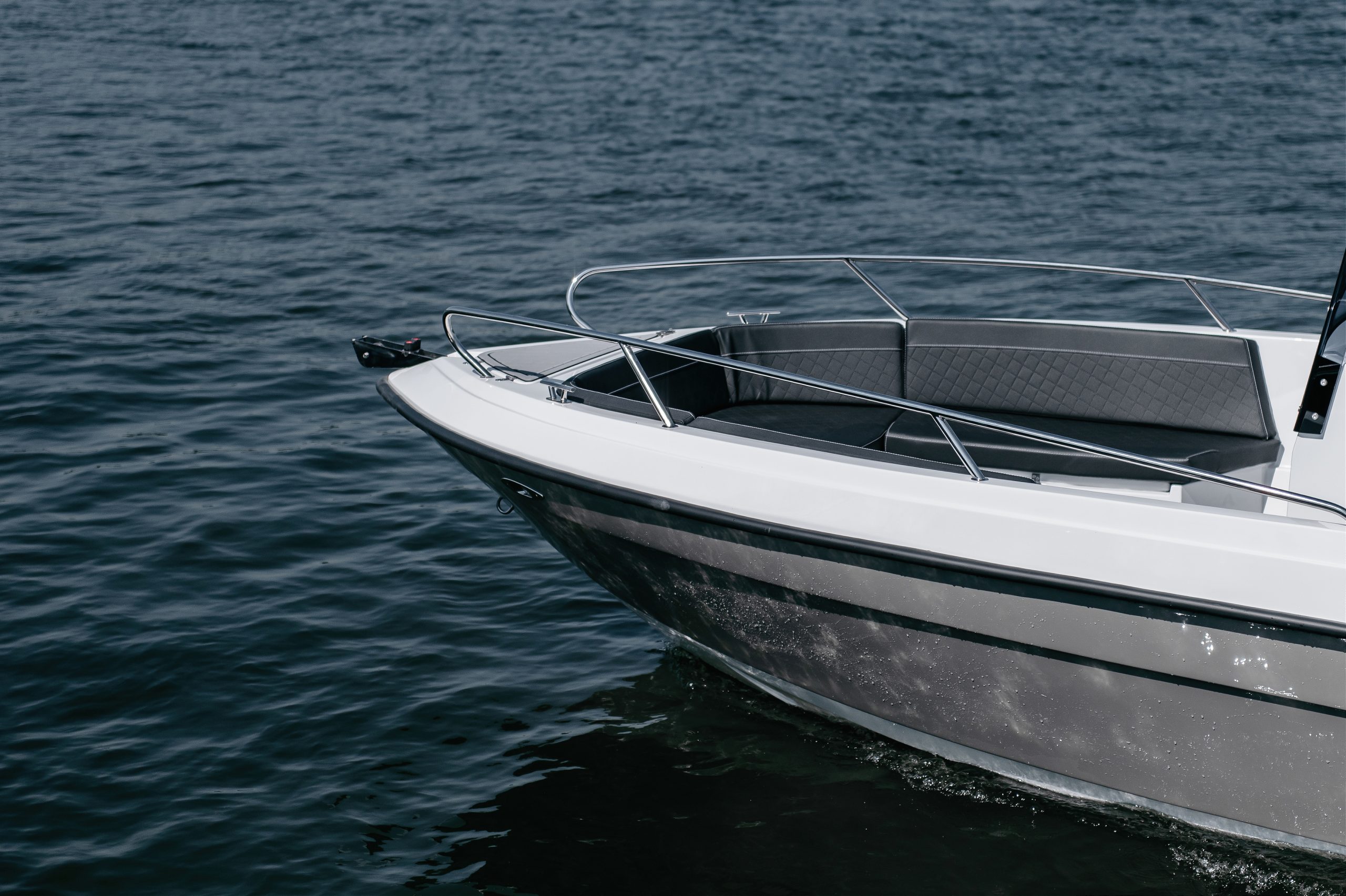 Die ergonomisch gestaltete Steuerkonsole garantiert dem Fahrer stets optimale Sicht und Kontrolle. Das vordere Sonnendeck lässt sich zusätzlich als gemütlicher Tischbereich nutzen. Zur Standardausstattung gehören eine robuste Bug-Ankerrolle sowie ein präzises Planetenlenksystem mit sportlichem Lenkrad.