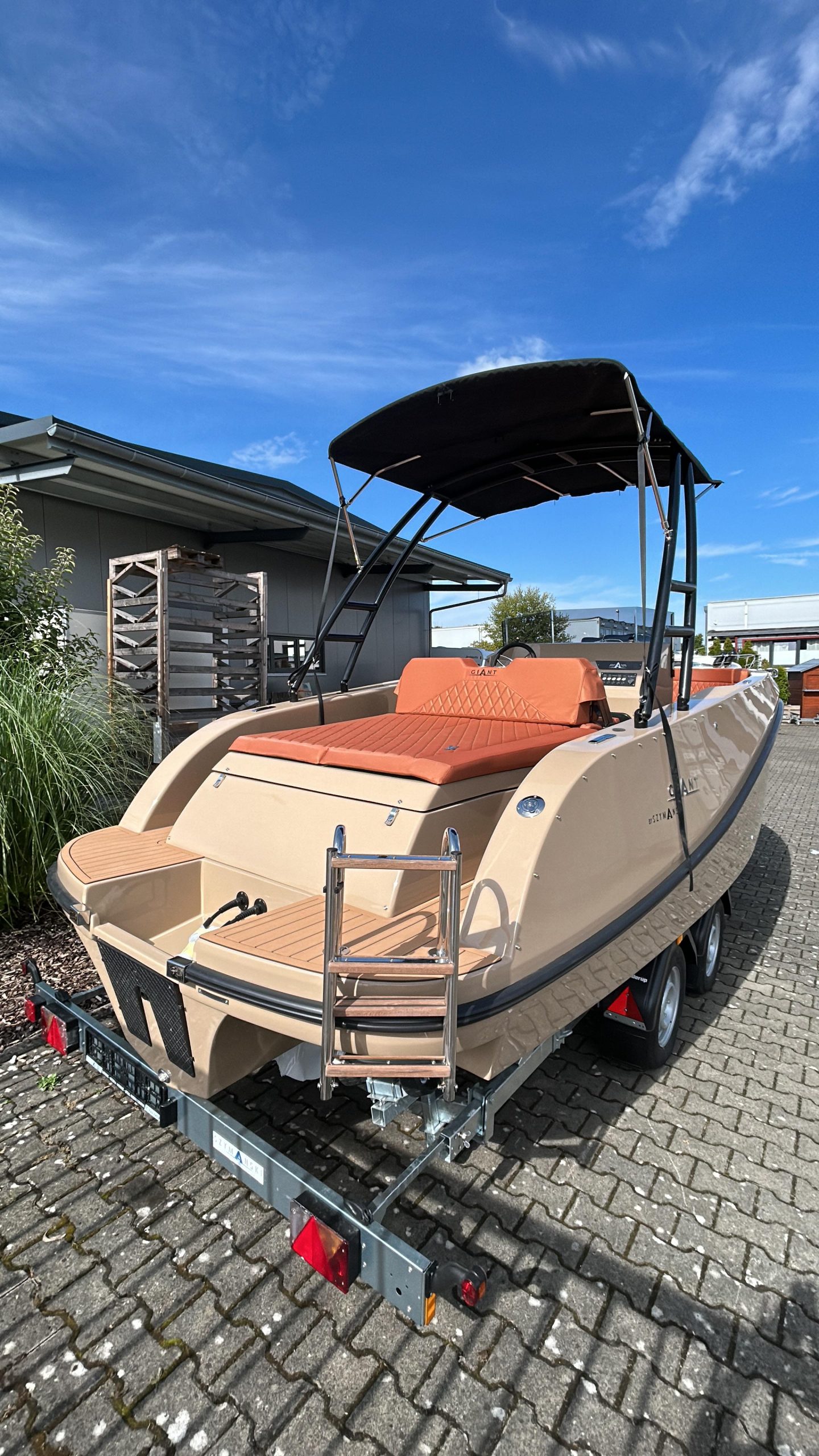 Der große Stauraum im Heckbereich ist besonders praktisch, um Ausrüstung oder persönliche Sachen sicher unterzubringen. Eine abnehmbare Badeleiter ist ebenfalls ein Plus, um das Ein- und Aussteigen aus dem Wasser zu erleichtern.