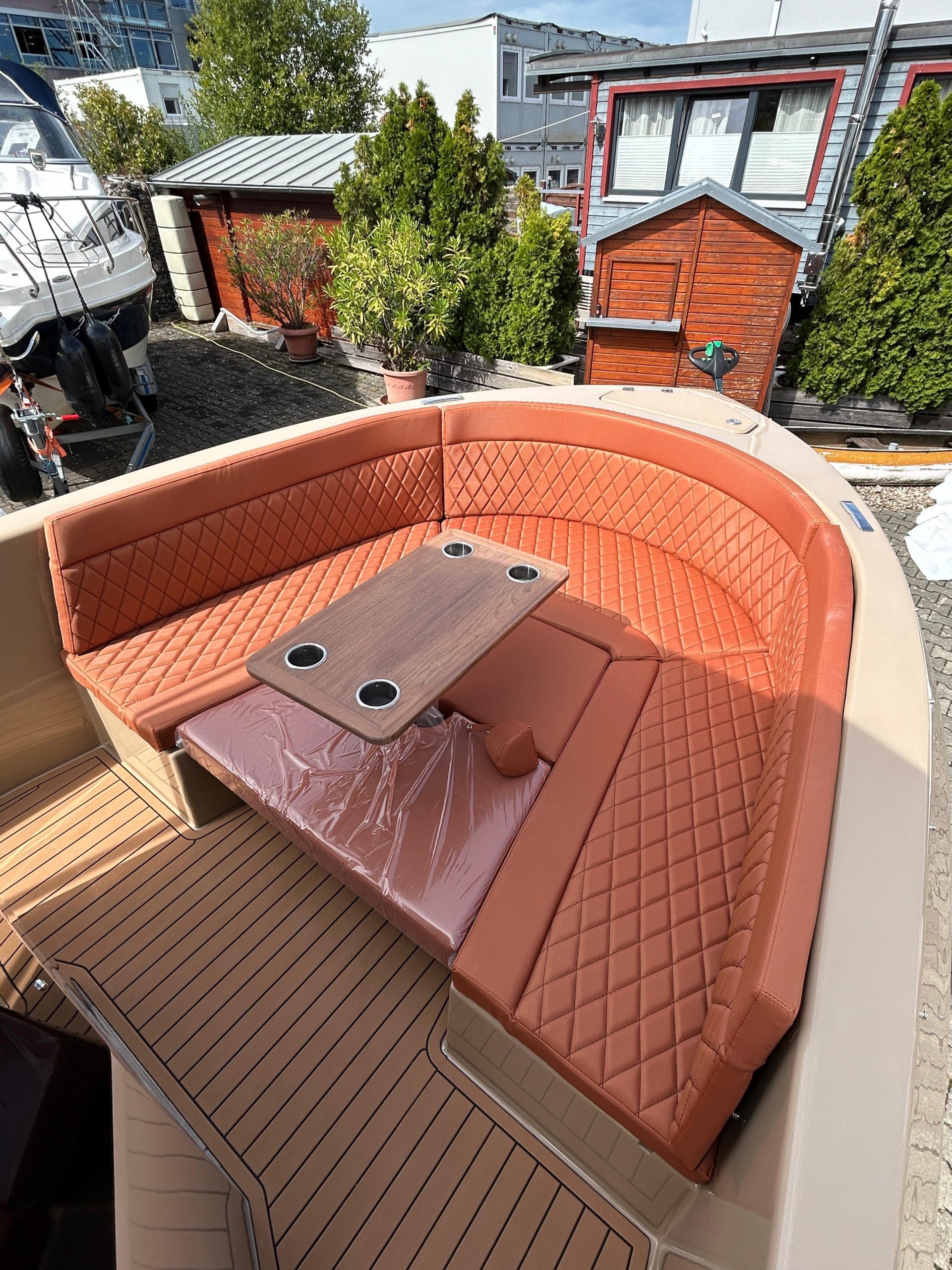 Die komfortable Sitzgruppe im Bugbereich, die auch zu einer großen Sonnenliege umgebaut werden kann, ist perfekt für Entspannung und gesellige Momente. Der zusätzliche Sonnenbereich im Heck sorgt dafür, dass mehrere Personen gleichzeitig in der Sonne relaxen können. Diese Details machen das Boot zu einem luxuriösen und praktischen Ort für längere Fahrten oder entspannte Tage auf dem Wasser.