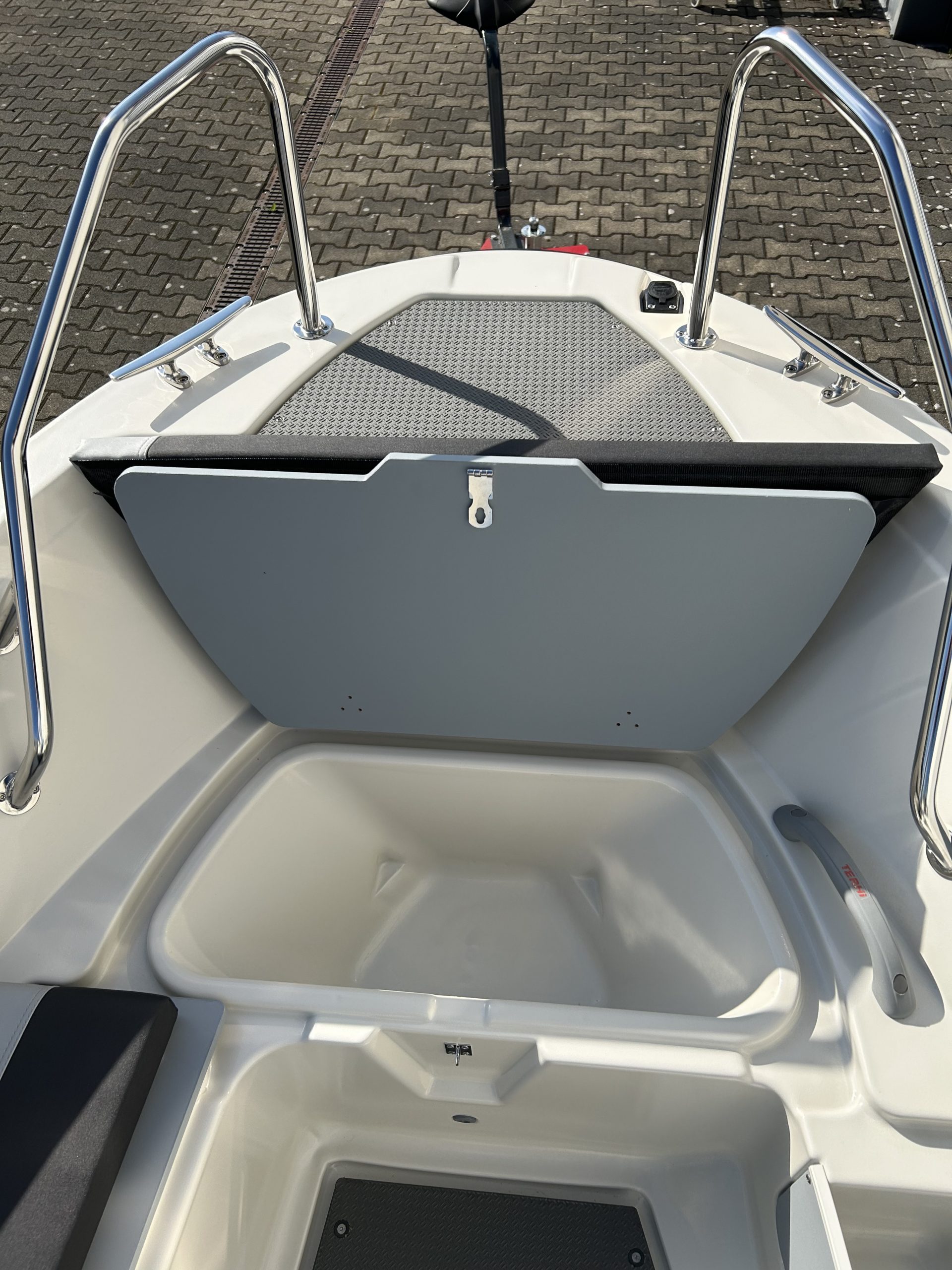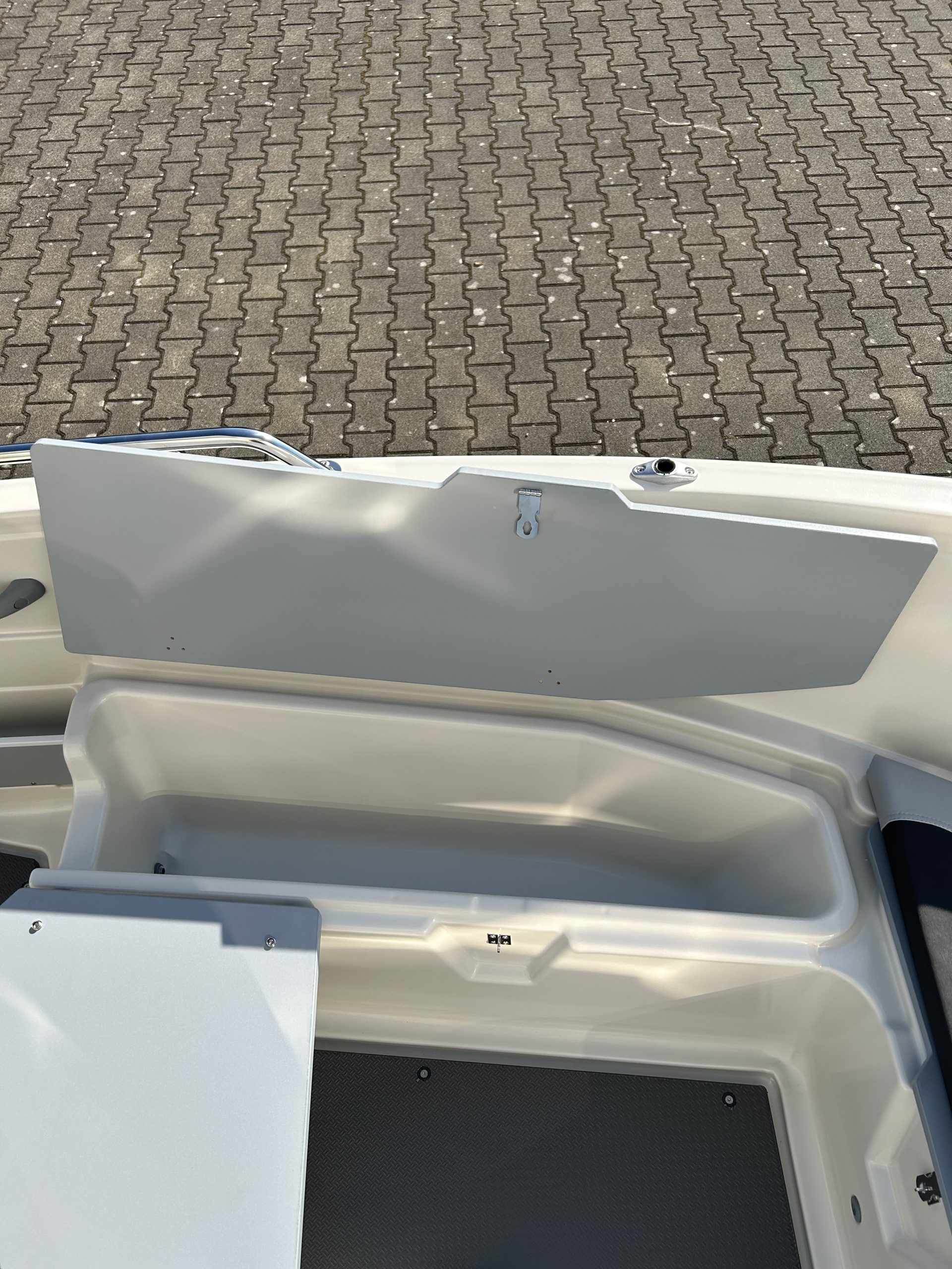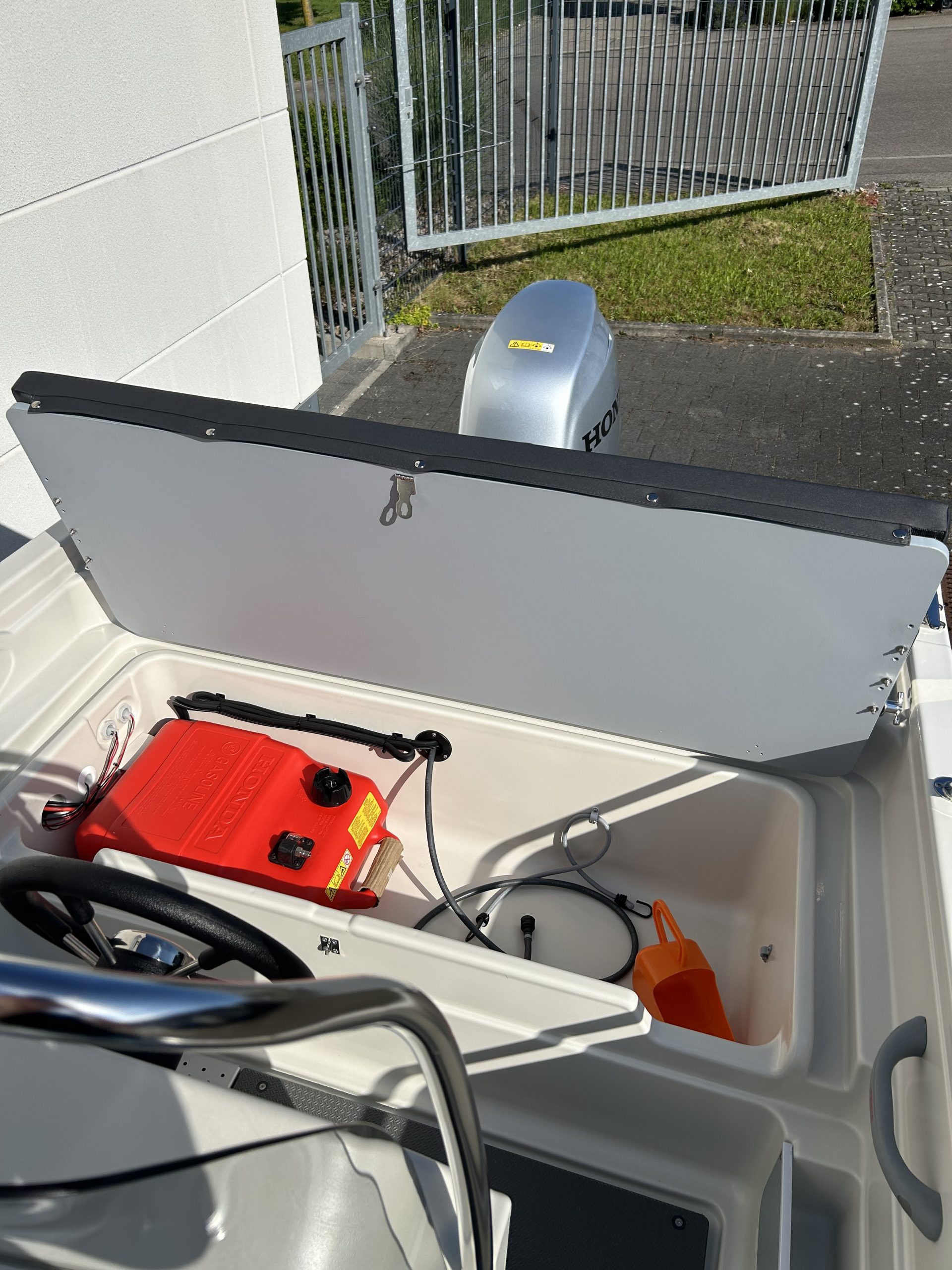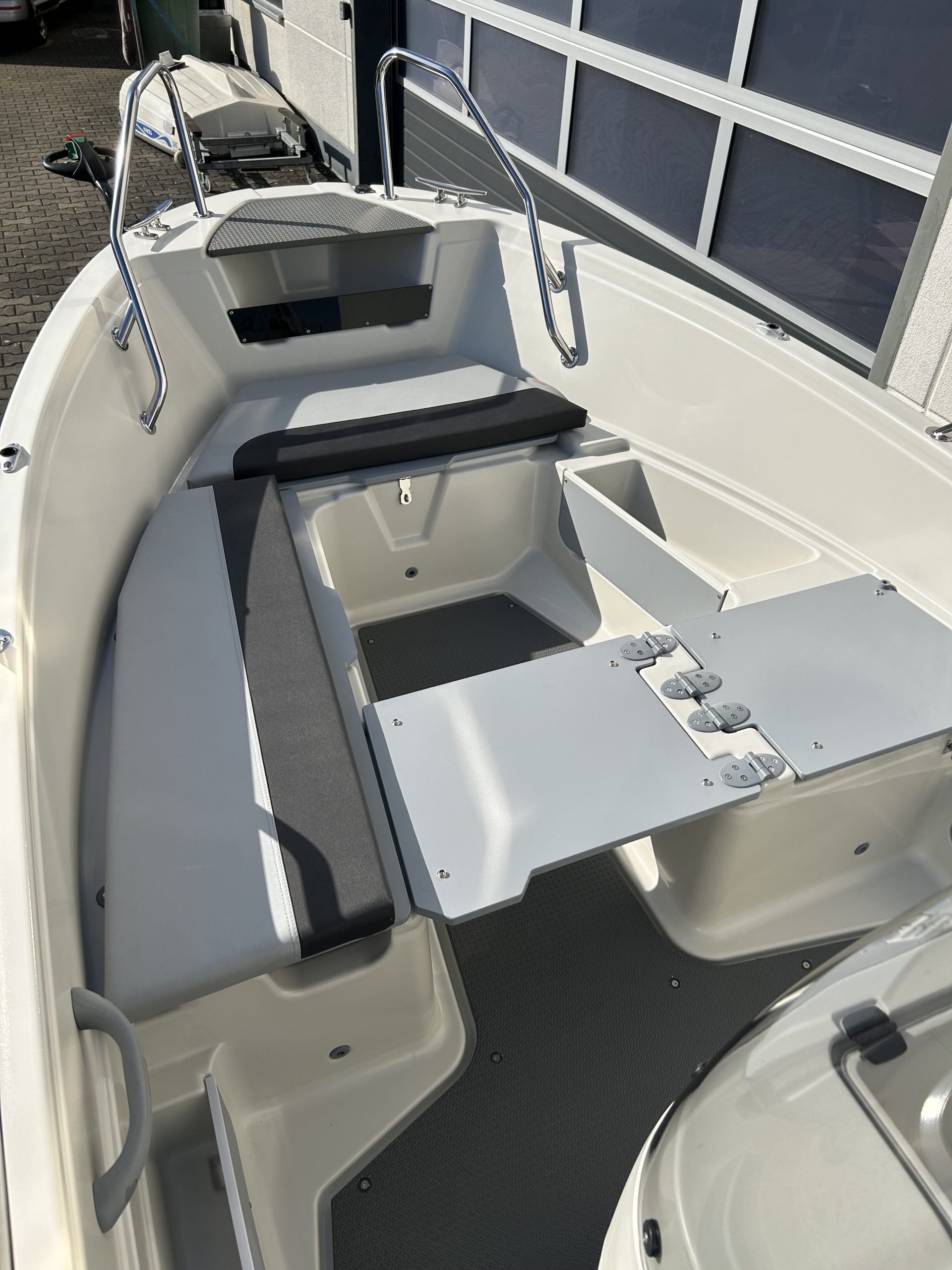 4 abschließbare Stauräume, Lenzventil, 5 Sitzbänke, Badeleiter, Dollenhalterung, Spiegelplatte, Scheuerleiste, Bugöse, Ablageflächen, Vorinstallation für Navigationsbeleuchtung, Steuerstand mit mechanischer Steuerung und Windschutzscheibe mit Haltebügel, 4 Klampen, Batteriekasten mit Hauptschalter, elektrische Bilgenpumpe
