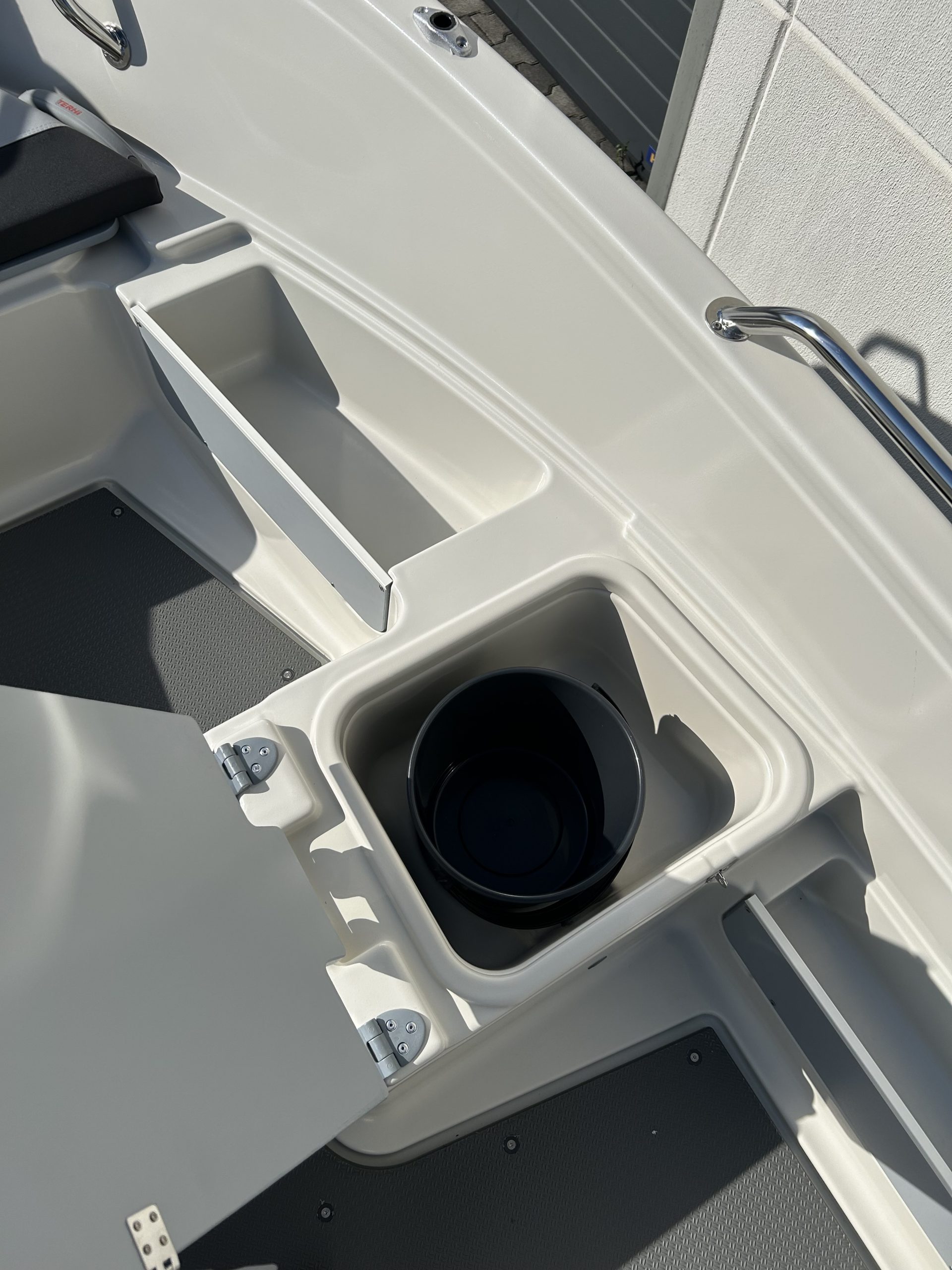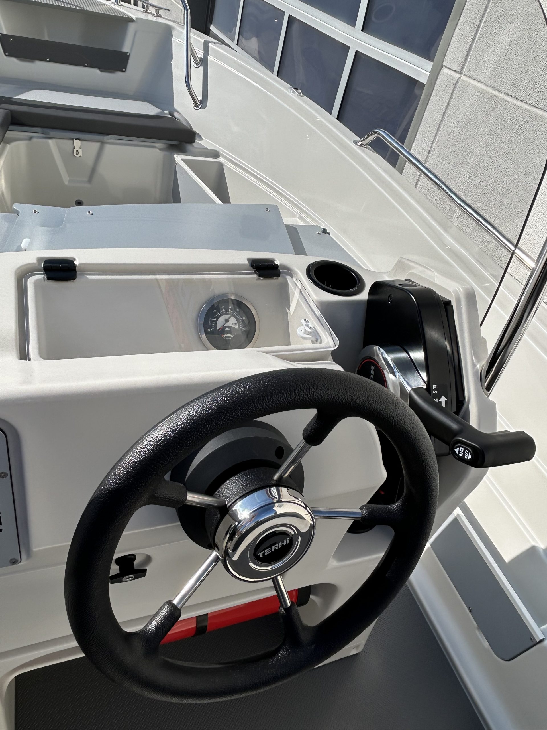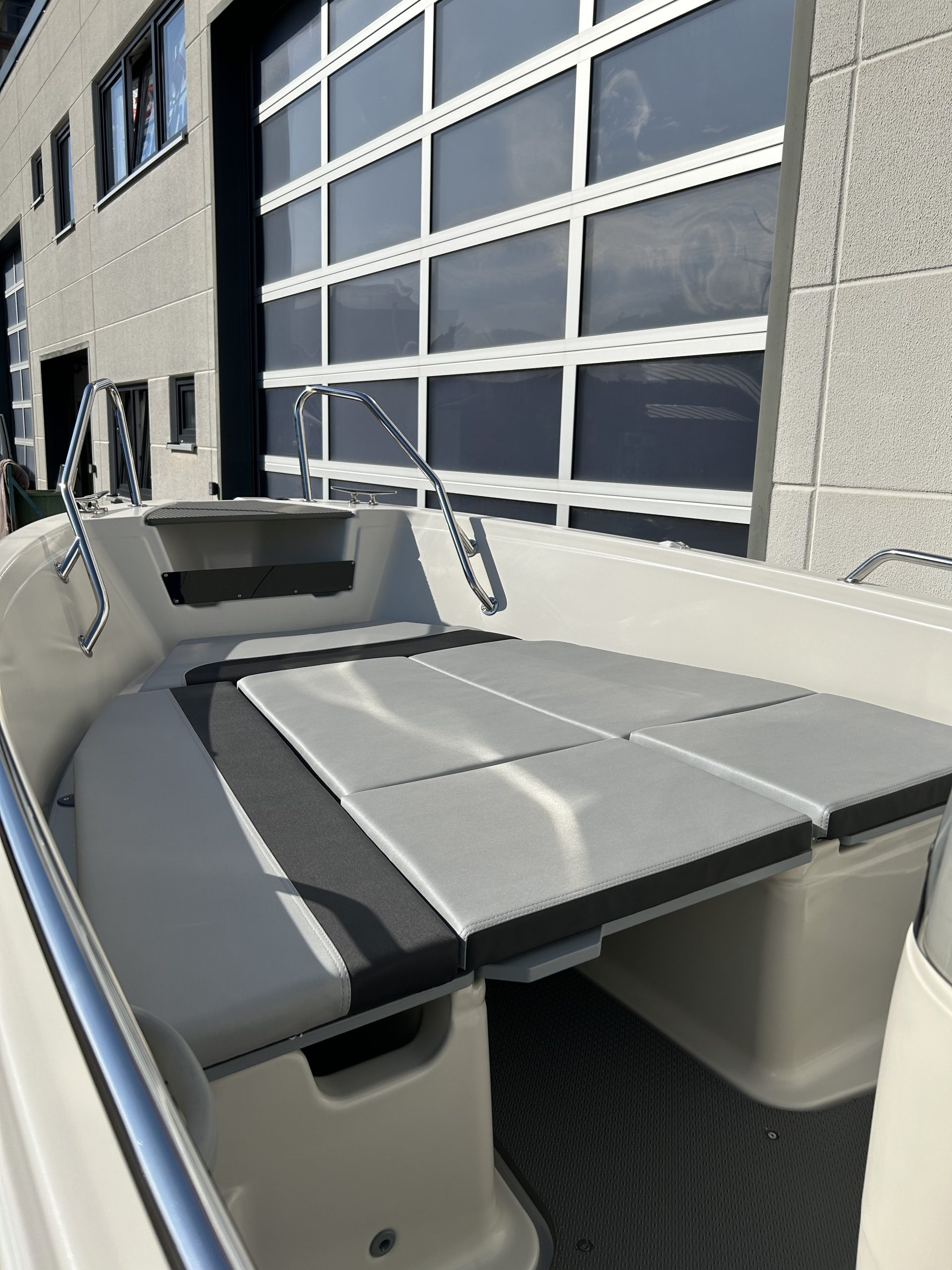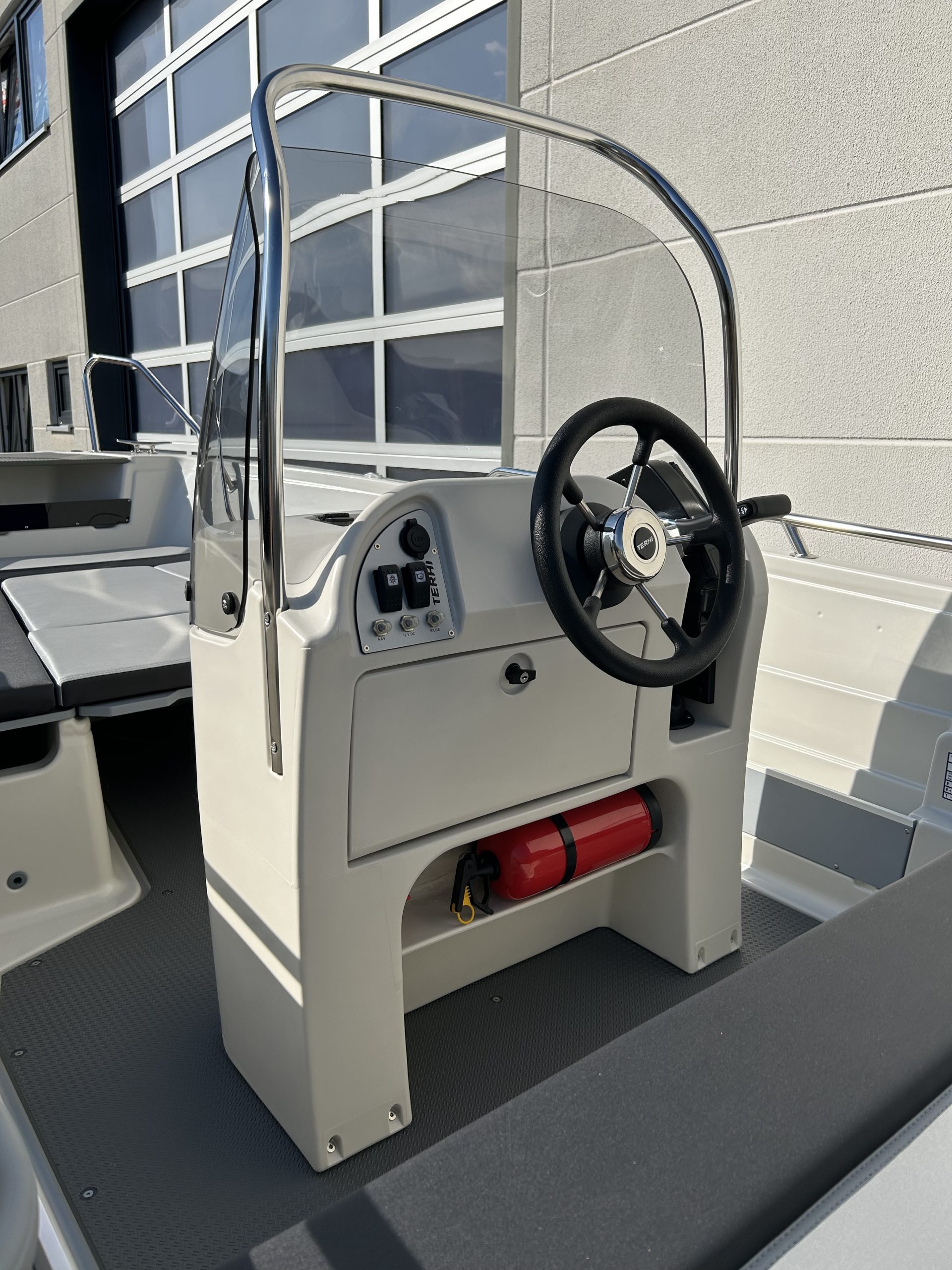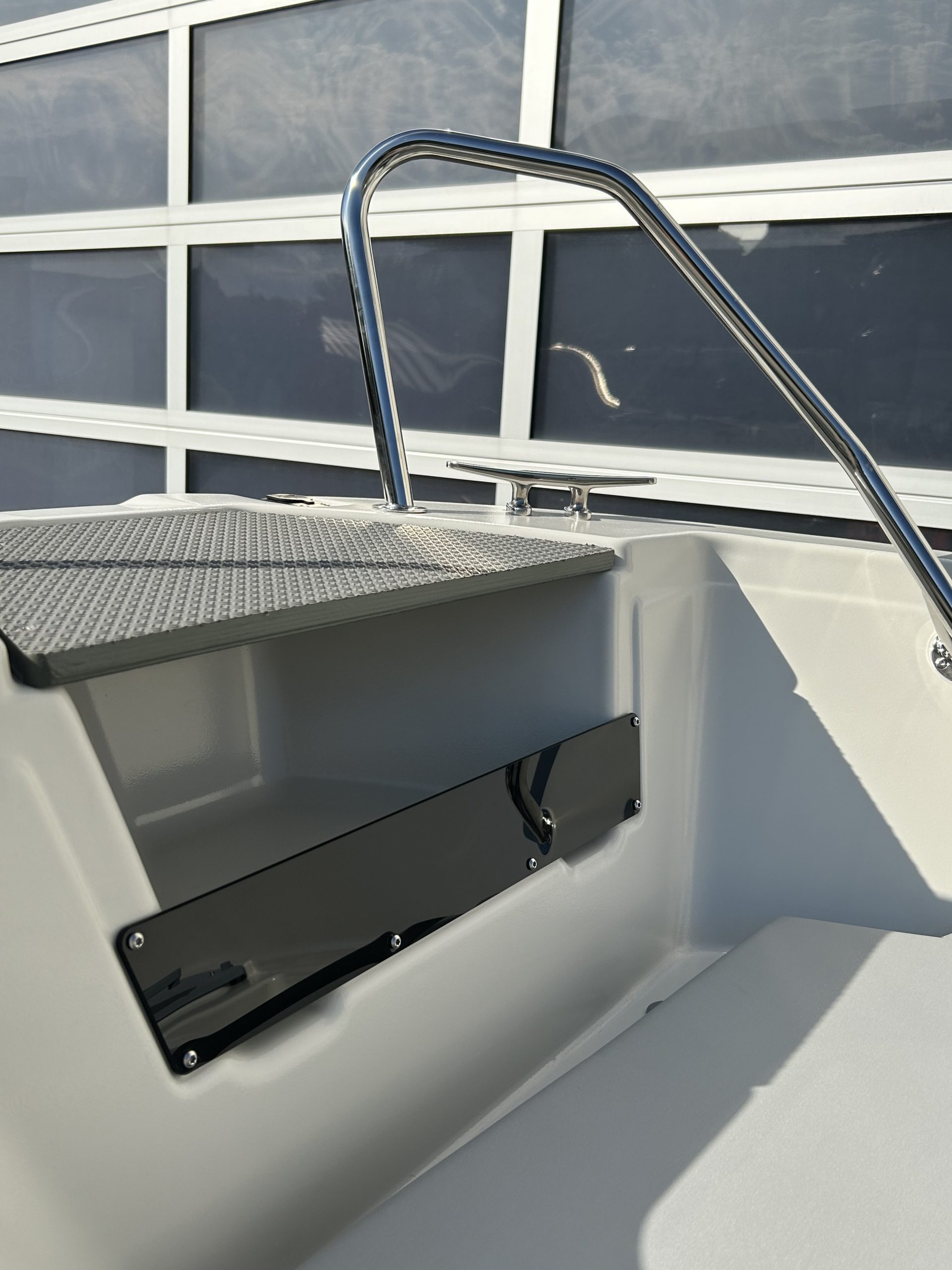 4 abschließbare Stauräume, Lenzventil, 5 Sitzbänke, Badeleiter, Dollenhalterung, Spiegelplatte, Scheuerleiste, Bugöse, Ablageflächen, Vorinstallation für Navigationsbeleuchtung, Steuerstand mit mechanischer Steuerung und Windschutzscheibe mit Haltebügel, 4 Klampen, Batteriekasten mit Hauptschalter, elektrische Bilgenpumpe